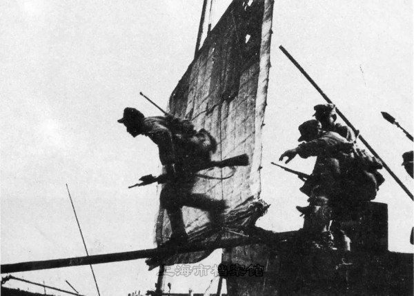 图说:1949年4月21日晚,百万雄师冒着猛烈的炮火横渡长江。来源:上海市档案馆藏、上海发布