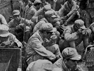 图说:解放军进入上海后,严守城市纪律,坐在马路边吃自带的干粮。(上海市档案馆藏)
