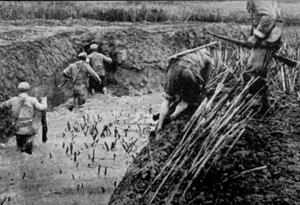 图说:破除鹿砦,越过深水壕沟,向敌军地堡冲锋。(上海市档案馆藏) 宝山烈士陵园