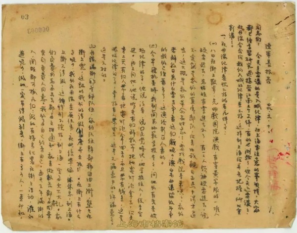 图说:陈毅就入城纪律问题发表了著名的丹阳讲话,上两图为当时的讲话记录稿。(上海市档案馆藏) 我们曾在上海市档案馆看到当时陈毅讲话的记录整理稿原稿,但是未能找到有关的图片资料。可惜大王庙已经荡然无存了,只能面对这块石碑,凭空想象一番陈老总慷慨激昂沙场点兵的场景。