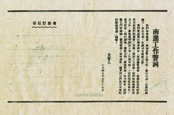 图说:准备接管上海的干部《工作誓词》。(上海市档案馆藏) 太仓浏河镇:打响上海战役第一枪