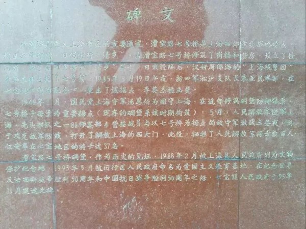 图说:漕宝路碉堡 1949年初,国民党军以这座碉堡为母堡,沿七宝蒲汇塘一线,利用自然地形,构筑了大量子堡。5月,解放军27军由松江、泗泾一线东进,15日攻占七宝,16日27军先头部队80师(一说81师)某部4营指战员向七号桥碉堡发起攻击,遭到国民党交警第11总队顽强抵抗,连续激战3天未能攻克,最后采取迂回战术,先攻打两侧阵地,然后越过蒲汇塘,最终攻克了七号桥防线,打开了解放上海市区的西大门。为此解放军付出了伤亡数百名战士的代价。