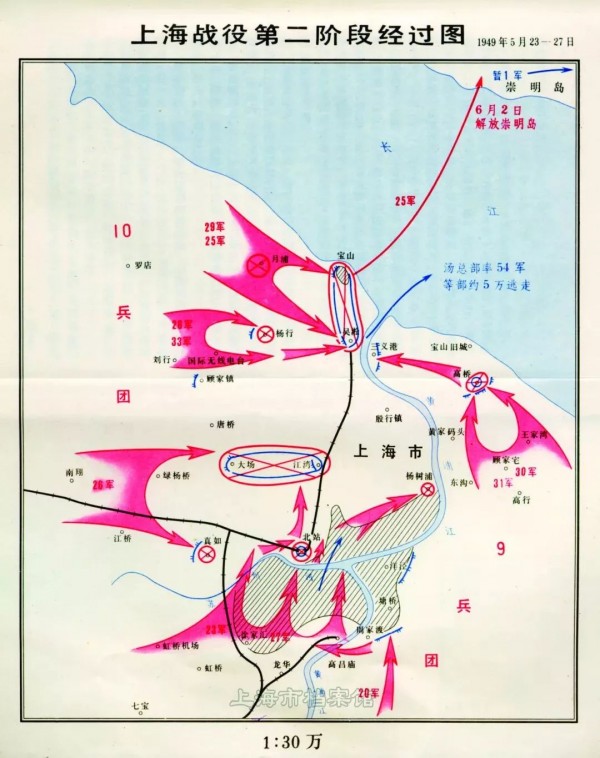 图说:解放军日夜兼程向上海进军。(上海市档案馆藏) 5月26日,上海解放在即,粟裕在金城新村签发了此役最后一项命令——《第三野战军淞沪警备命令》,于当夜率指挥机关离开苏州,经南翔于27日晨抵达上海市区。 上海市区篇 1949年5月23日夜,三野发起总攻,上海市区战斗打响。 漕宝路七号桥碉堡