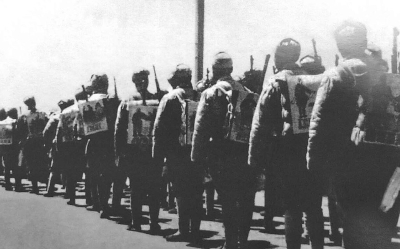 解放军战士们将“入城守则和纪律”绘成图片,挂在背包上,一边行军一边学习。(资料照片)