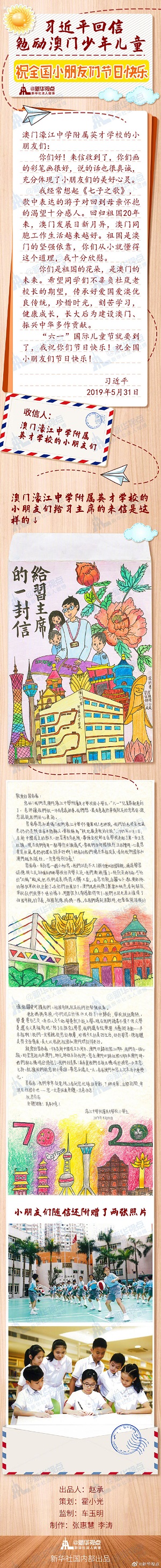 在“六一”国际儿童节来临之际,国家主席习近平5月31日给澳门濠江中学附属英才学校的小学生回信,对他们予以亲切勉励,并祝他们和全国的少年儿童节日快乐。
