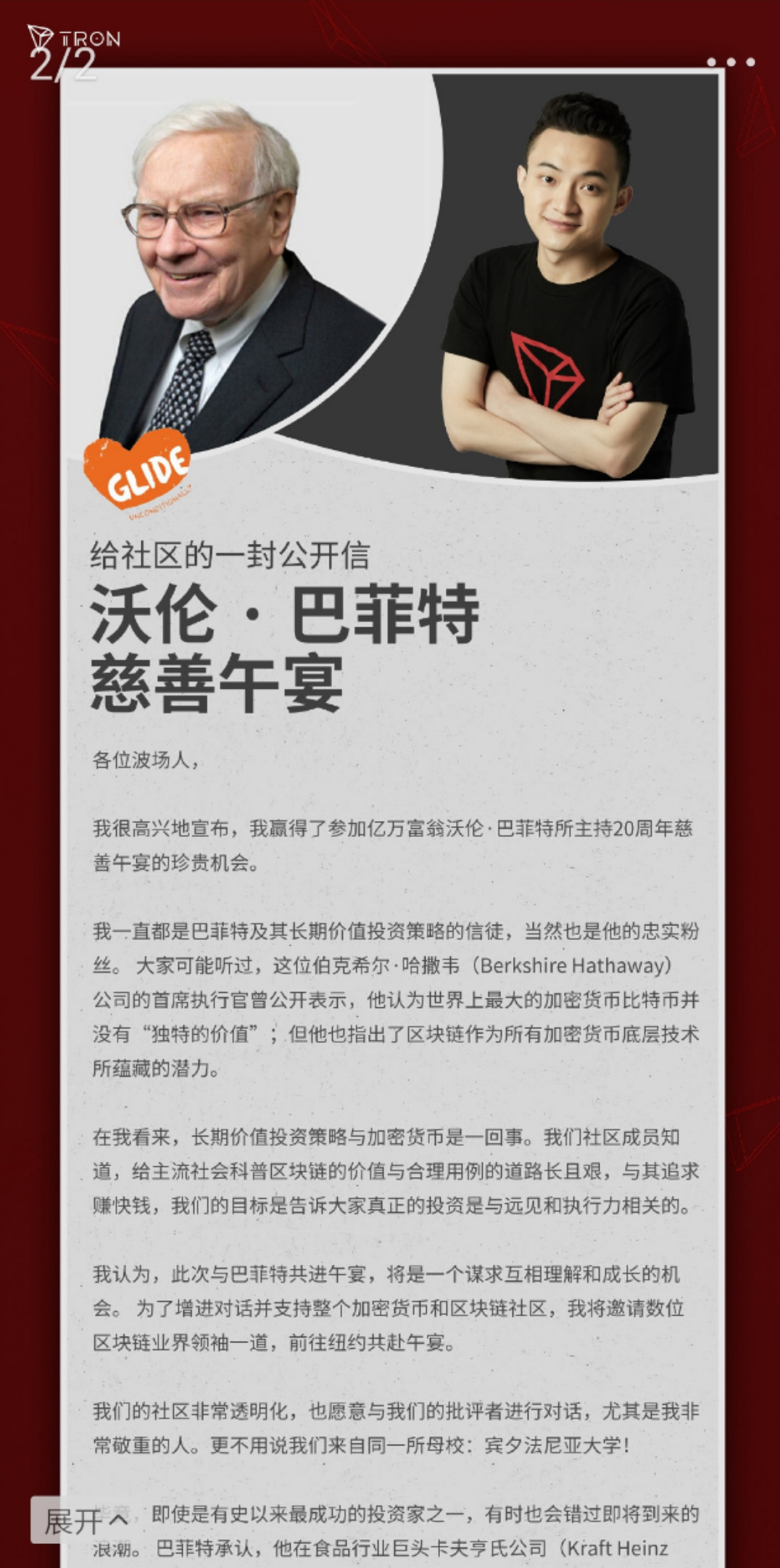6月4日凌晨,波场TRON创始人孙宇晨在其社交媒体账号上正式宣布,自己以创纪录的价格赢得了第20届巴菲特慈善午餐拍卖。根据拍卖规则,获胜者可以邀请7位朋友与巴菲特共进午餐,孙宇晨透露,他邀请对象会是区块链行业的领军者。 “我希望所有人都能有收获。”孙宇晨这样表示。 值得一提的是,“股神”巴菲特本人及其老搭档芒格过去不止一次表达过对于比特币的反感。 不过,对于和孙宇晨一起进餐,巴菲特依然表达出了期待之情。 据彭博社在北京时间6月4日凌晨的报道,巴菲特在写给助手的电子邮件中说:“我很高兴Justin(注:即孙宇晨的英文名)赢得了午餐,我期待见到他和他的朋友们。我们会度过一段美好的时光,格莱德基金会也将用他的这笔款项帮助数万人。” ![]()
