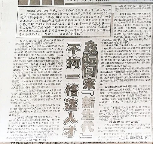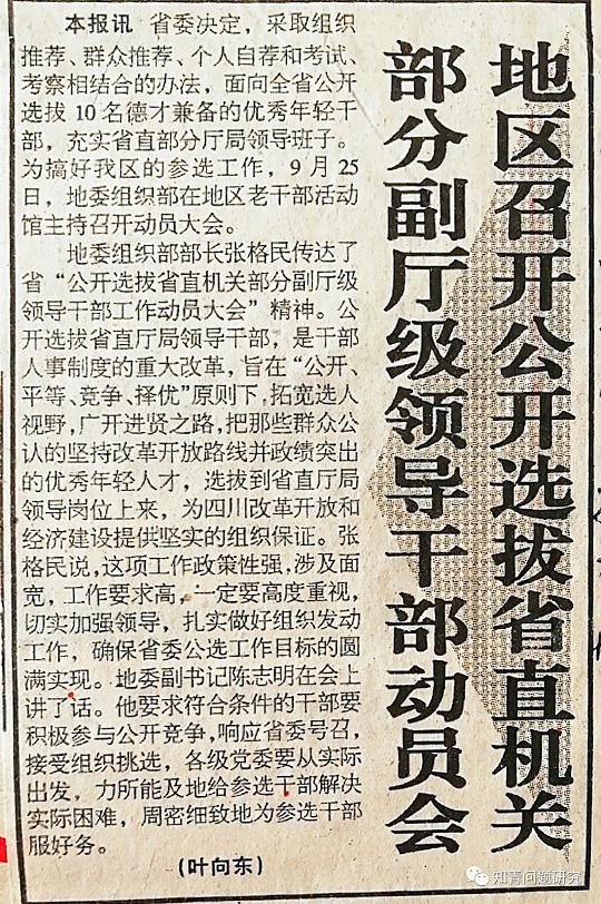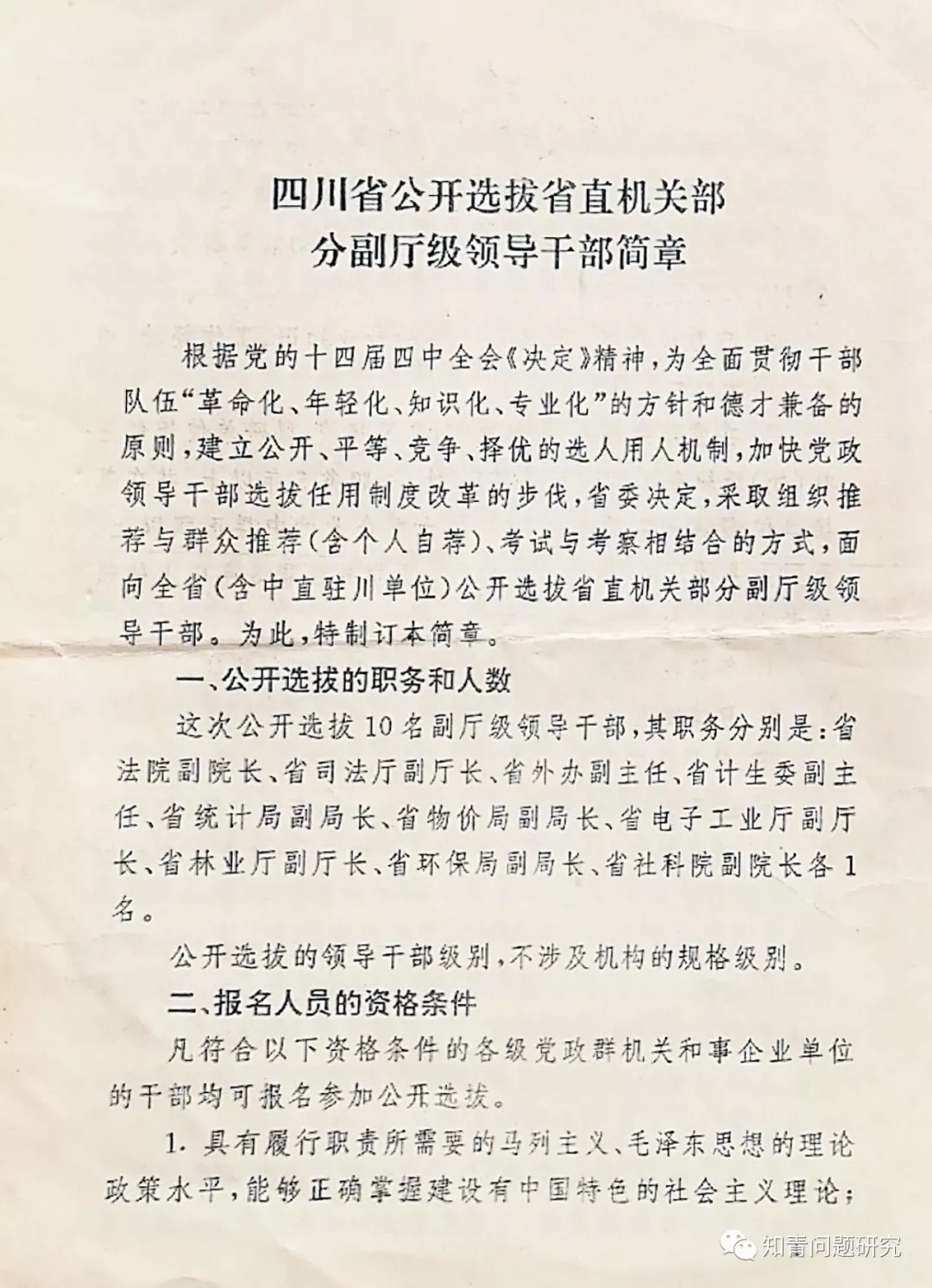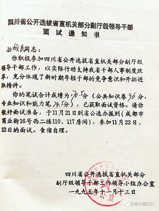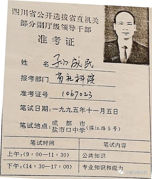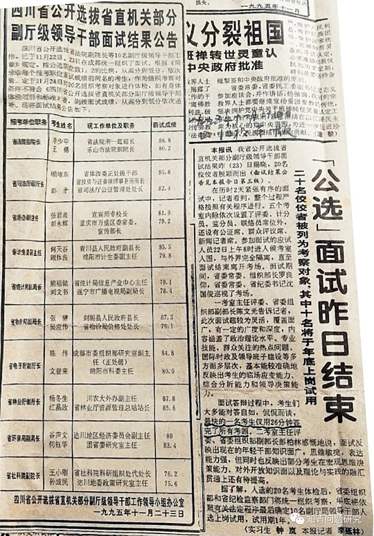 1995年9月,四川省委启动了公开选拔10名副厅级领导干部的工作(以下简称“公选”),历时3个多月。这是自改革开放以来,四川首次面向社会公开选拔副厅级领导干部,其“公选”规模、层次、影响在全国有较大影响。我作为报考者,有幸参与这次“公选”从报名、笔试、面试、考察等环节的全过程,最后被录取担任了省社科院副院长。 ![]() 一、得知“公选”信息 这年9月18日,《四川日报》在第一版刊出了省“公选”《简章》。报道称:省委决定采取组织推荐与群众推荐(含个人自荐)、考试与考察相结合的方式,面向社会公开选拔省法院副院长、省司法厅副厅长、省社科院副院长等10名副厅级领导干部。其报名资格、选拔办法、笔试考试、面试答辩、时间安排等均在《简章》中作出明确公告。消息发出后,立即在全省乃至全国引起较大反响。 当时,我在达川地委(今达州市)政研室工作,正忙于相关文件起草,直到9月25日地委组织部召开动员会议时,我才正式得知这一信息,并仔细听完了动员报告中的“公选”办法及资格条件。地委要求“全区符合报名条件的干部都应积极参与,其考试情况作为今后提拔使用的一个重要参考”。说实话,此前我并没有打算报名去参加这样一次考试,更没有考虑自己“晋升”的问题。在听取地委的动员报告后,我又不得不再次作出认真思考。 ![]() 二、进行自我评估 对照报名资格,我作了一下自我评估,其中几个基本条件是符合的。从任职年限来看,担任地委政研室副主任4年后又担任主任3个年头了,符合“担任正县级职务3年以上或副县级职务5年以上”的要求;从基层锻炼来看,下乡插队落户9年期间担任过公社党委书记两年后又在县委工作3年,符合“在基层单位锻炼1年以上”的要求;从年龄状况来看,已年满44周岁,符合“1951年1月1日以后出生”的要求;从文化程度来看,参工后到西南师范学院中文系干部专修班脱产学习两年并获取大专文凭,符合“具有大专以上文化程度”的要求。 仅管符合报名基本条件,但我并没有多少信心去参加这次公开“亮相”,因为我对自己的基础与实力是再清楚不过的了。1967年初中毕业不久,就上山下乡到开江县红岩公社4大队插队落户。由于父母都是教师,“坚持学习、必有好处”的教育使我刻骨铭心。在繁忙的生产劳动和艰苦的生活磨练中,我没有放弃学习,自学了初中、高中的语文、数学课程,阅读了哲学、政治经济学、科学社会主义等教科书籍,还学习了一些马列著作和毛主席著作,写下了数十万字的学习笔记和日记,也在农业生产实践和科学实验中发挥了一定作用。想不到的是,省委(1973)92号文件还对我的学习和锻炼给予了表彰。在农村学是学了不少,但系统性不强,还不扎实,我是心知肚明的。 ![]() 1978年6月,我离开农村调到县上工作。此后,尽管工作一直忙忙碌碌,还有结婚安家之个人大事,但“恶补”学业、探求新知,却是我始终的向往与不变的追求。我上过“函大”、读过“刊大”,也想着有朝一日到大学深造。说来也巧,1983年我调到当时的达县地委办公室工作已两年多了,全省组织人事部门在西南师范学院中文系开办一个干部专修班,报考名额分配到各地后需到“西师”进行一次文化考试。不知怎的,我并不在单位推荐的名额之内,可能一个重要理由就是因为我是“初中生”。在要求单位先行考试一次再推荐名额的呼声下,我才被确定为“可去试一试”的人选。殊不知,这一考,在全省的名次我不清楚,但在全区的这批考生中还处于前列,被录取了。通过这次检验,使我对自己的底细有了较清楚的认识,也摸到了我们这一代人学业水平的实际状况。可以说,这是我对参加全省“公选”能够增强信心的一个重要因素。 ![]() 三、选择报考职位 无论是“组织推荐”还是“个人自荐”,都要填写“报名及资格审查表”。这张表中,有一个栏目是“选报单位及职务”,经权衡比较,我选择了“四川省社科院副院长”职位作为第一志愿。 之所以选择报考省社科院的职位,主要是考虑到我当时所从事的工作与社科院有许多接近或相通的地方。特别是我已在地委政研室工作了15年之久,担任领导职务也已7年多时间。这些年来在地委决策研究和咨询部门工作,承担了较多重点调研课题和重要文件、报告的拟草工作,在实践中逐步提高了政策理论水平,也拓宽了知识面。与此同时,较长时间从事政策研究工作,在某种程度上说,已成为了我的一种工作兴趣,对社科研究有着独特的偏好。 还有一个重要因素是,我与省社科院曾有一些工作接触。1994年4月,我担任政研室主任还不到半年,省社科院派员到地委联系工作,主要是来商议筹建“省社科院达川分院”的事项。随后,我抓紧拟草报告,经地委讨论同意后,转送省社科院批复。不到1个月时间,四川省社科院达川分院正式挂牌,由地委分管副书记兼任院长,我担任常务副院长。这年9月,我被省社科院聘为特约副研究员,此后,又参加了省社科院的一些研讨会,参与了一些专家学者的调研工作等。这些接触与活动,使我天然地加深了对省社科院的情感。 ![]() 四、做好应考准备 既然已经填交了报考志愿,就要按程序“走下去”了。1995年10月26日,也就是在参加动员会之后一个月,报名资格审查名单经省批准并正式公布。全省报名参加这次“公选”共627人,经审查符合报考资格的有484人。