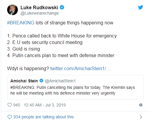 ![]() 翻译如下: #突发#很多事看上去太奇怪了: 1 彭斯被紧急召回白宫,紧急 2 欧盟紧急召开安全理事会会议 3 黄金价格上涨 4 普京取消原定计划改为与国防部长开会 到底发生了什么? 但随后,也有人进行了一定程度的澄清,但也提出了问题 ![]() 把那些乱猜和阴谋论抛在一边,美国高级官员说,彭斯行程突然取消与下列事项无关: 1 副总统(彭斯)的健康 2 特朗普的健康 3 普京取消既定行程改与国防部长开会 但我们不知道他到底为什么突然返回华盛顿特区。 RT说,就在这些留言传播的时候,事实上应该看到,欧盟没有一个机构叫“欧盟安全理事会”。推特上也有人注意到这一点: ![]() 不要再发推了,压根没有“欧盟安全理事会”这玩意儿。 RT说,可是流言仍然在继续传播。 白宫不得不出面否认,称没有人紧急召回彭斯,也没有任何值得担心的事情发生。 RT最后说,其实,如果真有大事发生,当然应该看看特朗普的反应。可是怎么好像没人告诉特朗普俄罗斯的事故背后有隐情啊,人家还在兴高采烈地推荐他要求加上军事秀内容的独立日庆典呢。 ![]() 责编:日升 (责任编辑:日升) |
