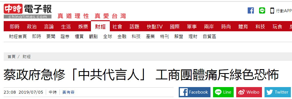 台媒报道截图 综合台湾“中时电子报”《联合报》等媒体报道,蔡英文5日在脸书上声称,要借此举“严格规范”台湾民众、法人、团体或机构为大陆进行“危害”台湾安全的政治宣传、发表声明,参加大陆所举办的会议。 台湾“中时电子报”报道称,蔡英文一再宣称,海基会才是台当局两岸事务唯一交流管道。届时台民众赴大陆与对方共同发表“倡议”、“愿景”都适用。但外界关心,以后包括海峡论坛、两岸企业家峰会、两岸媒体高层峰会等大陆主办或两岸合办的会议,将如何规范及认定何谓发表“危害”台湾安全的声明? 此外,报道称,有岛内工商界人士认为,目前两岸官方交流已停摆,仅剩民间交流,而工商团体都属法人、团体,这“代言(理)”定义不清不楚,乱扣帽子,恐造成寒蝉效应,等于是要全面关闭两岸交流。 据报道,台湾工业总会秘书长蔡练生批评,在蔡当局执政“两岸交流停顿”的状态下,当局应善用民间与大陆交流管道,而不该“反其道而行”。 台湾商业总会理事长赖正镒认为,这将对两岸政治经贸都相当不利,他直言,这几年一直都是由民间团体代替台当局,作为和大陆沟通的桥梁。他说,每年大陆各省各市代表团来台,都是各工商团体负责接待,工商团体也时常到大陆参访、替台商发声,这些都对台湾企业非常重要。 台湾企业界也一片反弹,认为产业需要的很简单,就是“市场”,无论大陆、欧美,对企业来说都很重要,不该一昧“封闭”所有交流。 同时,国民党副发言人黄心华则质疑,何谓“代理人”?何谓“政治活动”?国民党强烈反对蔡英文采用这种充满模糊、无法明确定义的法条企图陷人入罪。国民党“立法院”党团总召曾铭宗则表示,国民党高度怀疑这样的“修法”,根本就是为了蔡英文2020选战准备进行操作。