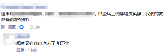 还有的网友质疑,“那些兵士们都嘻皮笑脸,我们的友邦是这么怪的?”更友网友调侃,“想着又有钱白送来了,能不笑?”