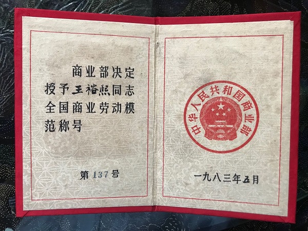 图说:王裕熙老曾荣获4次全国商业部劳动模范
