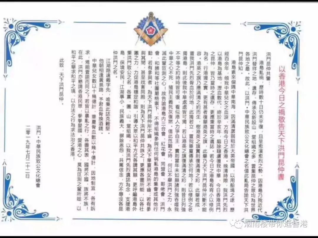 ![]() 以香港今日之祸敬告天下洪门昆仲书 洪门昆仲共鉴: 港岛乱祸,历时数十日仍未平复,且呈愈演愈烈之势,因港岛乃我近代洪门发祥之地,遗存、传承及新设山、堂组织之多,云集昆仲之众均为世界各地之最,故此,以洪门.中华民族致公文化总会之名值此乱局告谕天下洪门昆仲知。 港岛素来偏隅中华南海,因满清孱弱租于大英帝国,以用船坞之途,历经百余年,倾我中华儿女之血泪,方有今日之香港。晚清时际,我洪门先烈以港岛为基地,沥血数代,终于辛亥年,驱除鞑虏复我中华,今日香港洪门之昆仲,皆乃当时之遗存,更应秉当时之遗志。若今日之港岛有宵小以修例为名,行港独之实,更有甚者,复举港英之旗,此举乃天下洪门昆仲所断不能容,港英之旗乃应满清之约而生,树港英之旗实则复满清之约,此举若成,置我洪门先烈骨血于何地,此独若立,置我华夏传承于何地?若以修例知名独港岛,则此后我中华处处皆可独,若以港英之旗复满清之约,则昔日列强不平等条约皆可复,看似港人之力争自主,实则当年未如愿诸列强吞噬我中华之心不死,殖民主义死灰复燃,值此为难之时,何以不举洪门之力,永灭此辈叵测之心,故告谕港岛内之三合会、红花会、同盟会、哥佬会、洪门会、和胜和等社团严格御下,不得组织参与任何祸乱港岛的集会或其他行动,若有参与者,为天下洪门昆仲所不齿,为天下华夏儿女所不齿,如有参与其间,甚至残害同胞,则为天下洪门所共诛之!更应各尽所能,以各社团之力,力促港岛稳定和谐,引导大众以和平方式各请其愿,更呼吁港岛外秉洪门致公之名,各党、团、山、堂组织,以我洪门先烈遗志为念,支援港岛,保境安民!江湖事小,民族义大,摒除恩怨、共笃信念,方不辱没各昆仲洪门之名。 江湖路远义字先,唯秉此志克难坚。 他朝相逢黄泉路,予君血骨换酒钱。 中华儿女数以十几亿计,华夏骨血数以十几亿计,因地制宜,各有诉求,焉能一语而同之,若皆以暴乱之行,各尽其表,国将不国,族将不族。 在此,洪门亦恳请香港民众,拳拳爱国,爱港之心,莫为叵测之辈所趁,以和平之举求和平之境,以合法之行为求法治之香港。 此致,天下洪门昆仲 传 (责任编辑:晓歌) |