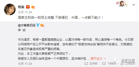 女主演杨紫工作室也发布声明称,杨紫本人及团队始终坚持一个中国原则,坚决维护祖国统一,坚定捍卫国家主权和领土完整,反对任何分离祖国的言论及行为。希望广大网友辨清事实,不信谣不传谣。 杨紫随后转发评论称,“中国,一点都不能少!”