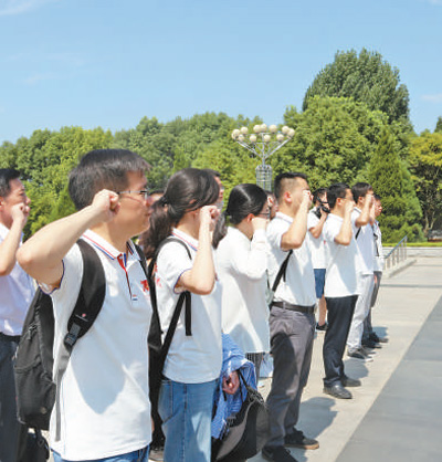 再走长征路的记者们在黄麻起义和鄂豫皖苏区革命烈士纪念碑前重温入党誓词。 记者 范昊天摄