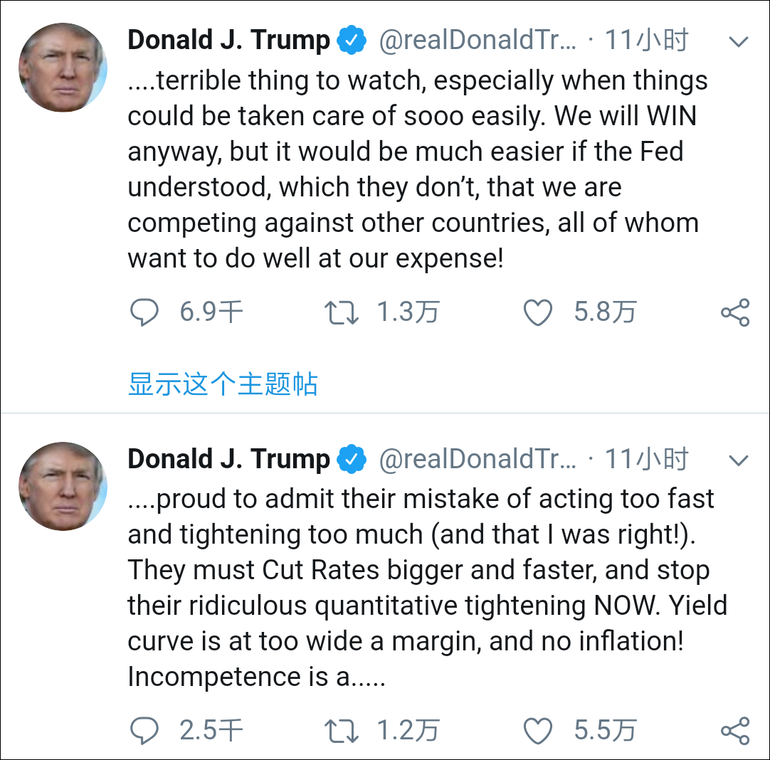 尽管四位前主席联合呼吁保持美联储独立性,然而,反复“抱怨”现行货币政策对贸易摩擦不利的美国总统特朗普,没有丝毫降低“火力”的意思。 昨天,特朗普再次发推怒斥美联储,声称美国的麻烦不在中国,而在美联储。 并且,他仍在吹嘘,其领导的贸易战如今正在不断地“加强美国,削弱对手”,但是由于美联储太无能,且死不悔改,就是拒绝放松过分紧缩的政策,还总是不肯又快又狠地降息,为美国赢得贸易战平添了障碍。 除了昨天发推安慰美国农民,特朗普再次试图“稳定军心”,称贸易战肯定能赢,如果美联储肯配合,那会让他们赢得更轻松一点。