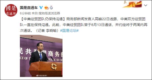 中美经贸团队仍保持沟通 高峰称,8月13日晚,刘鹤副总理应约与美国贸易代表莱特希泽、财政部长姆努钦通话。双方约定在之后两周内再次通话。双方经贸团队一直保持着沟通。