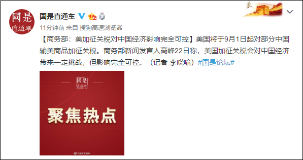 加征关税对中国经济影响完全可控 高峰称,美方举措会给中国的出口和经济带来一定挑战,但总体上看,“影响完全可控”。中方有信心、有决心、有能力应对各种挑战,保持中国经济和外贸健康稳定发展。