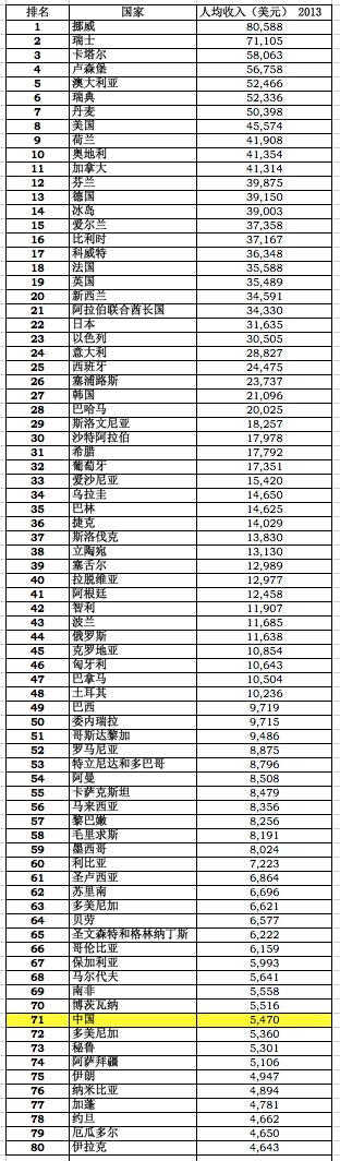 长假,不少人开始打算出国游顺便买买买,很多网站更是推波助澜地把12天假期全球扫货的购物清单都帮你拟好了,不少国家也早就简化签证手续以争取更多的中国人前来扫货,一时间真的让人感觉中国人实在是太富裕了。但究竟富裕到什么程度呢?我不禁有些好奇,于是去世界银行的网站看看人均收入的统计数据(见下表)。这一看不要紧,我还真有点灰心,因为按2013年(2014年还没有统计出来)世界银行统计的人均收入,在166个有数据的国家里,中国只以人均5470美元位于第71位,比起马来西亚(8356美元)要少近三千美元,比韩国(21096美元)和日本(31635美元)少得就更可观了,甚至不如我们经常援助的委内瑞拉,真的有点让人情何以堪的感觉。人均收入世界前80位国家一览表(2013年)