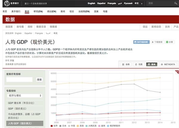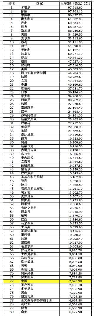 人均收入统计数据 如果选取一些数据放在下面的图中来看的话,红线是世界平均人均收入水平,深灰色是中国,很悲催的是,中国人的人均收入水平居然是低于世界平均水平的,也就是说,中国连称为中等收入国家都有点勉强。而马来西亚(浅绿)则接近世界平均水平,韩国(黄色)、日本(浅灰)、法国(浅蓝)和美国(粉色)高过世界平均水平的幅度依次增加,我们在人均收入上和世界的差距不言自明。 人均调整国民收入净额 从国民生产总值(GDP)来看,我们是世界第二大经济体,可以说从国家的角度来说中国真是很富裕了,但从人均GDP看却非常不理想,根据世界银行2014年的统计数据,中国的人均GDP只有7594美元,在170个有数据的国家中排在第72 位(见下表),环顾周围排在同一个水平的国家,不管你怎么想,反正我是有点气馁的。人均GDP世界前80位国家一览表(2014年)