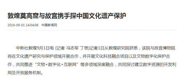 其二,在利用和弘扬方面。 以敦煌研究院为例。 8月30日上午,“一带一路”与中西方文化互学互鉴论坛在敦煌举行。敦煌研究院院长赵声良表示,在“一带一路”建设中,我们将进一步与丝绸之路沿线国家建立合作与交流,推动文化遗产保护与管理,把敦煌艺术传播到海外,通过国际合作保护世界文化遗产。 9月1日中新社报道称,敦煌研究院与故宫博物院将在文化遗产研究与保护领域开展合作,共同探讨建立数字资源的开发利用及开放服务机制。