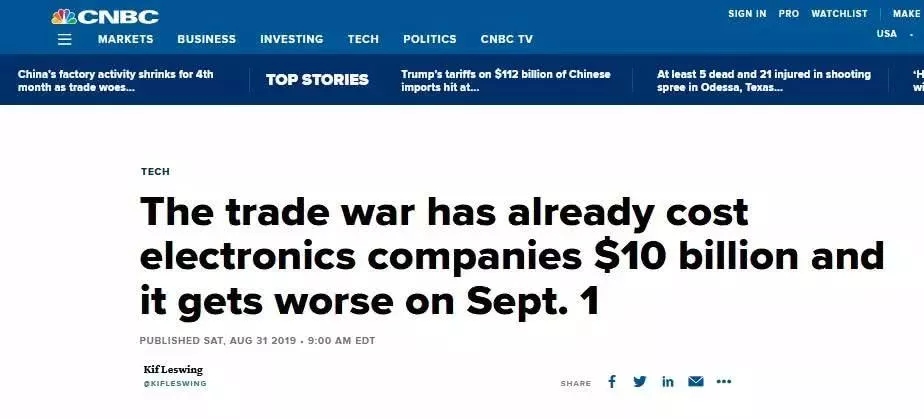“如果你需要一台新电视,可得考虑趁早买。”这是美国消费者新闻与商业频道(CNBC)当地时间8月31日向美国民众发出的一句“忠告”。为什么呢? 特朗普的对华新关税即将于当地时间周日(9月1日)生效,CNBC当天给特朗普算了一笔账,强调“贸易战已经让(美国)电子公司损失了100亿美元(约合715亿元人民币),而9月1日(开始)情况将更糟”。CNBC还说,(美国)消费者的钱包将开始受到冲击。 ![]()
