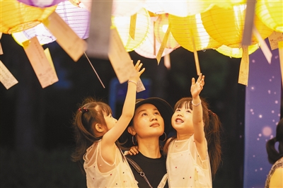 9月12日,浙江宁波月湖西广场,市民们在赏灯猜谜。 沙燚杉摄(影像中国)