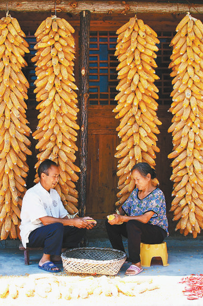 9月13日,贵州省铜仁市印江土家族苗族自治县新寨镇泗塘村农民正在给丰收的玉米脱粒。 左禹华摄(影像中国)
