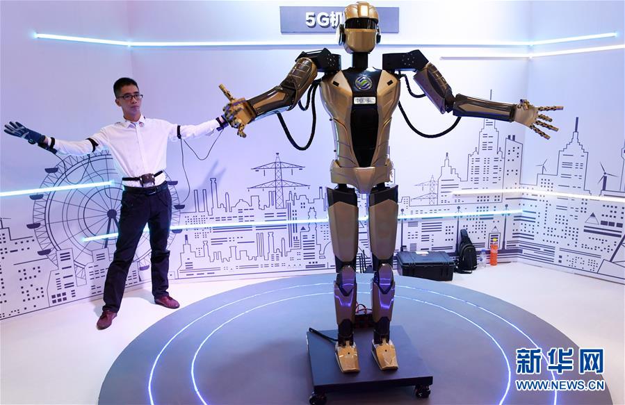 在第十二届中国-东北亚博览会上,一名参观者体验同步操控5G机器人(8月23日摄)。新华社记者 林宏 摄