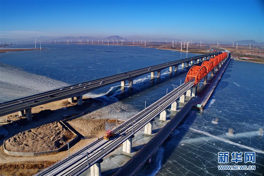 中铁三局工人在河北张家口京张高铁官厅水库特大桥进行铺轨作业(1月13日无人机拍摄)。新华社记者 杨世尧 摄