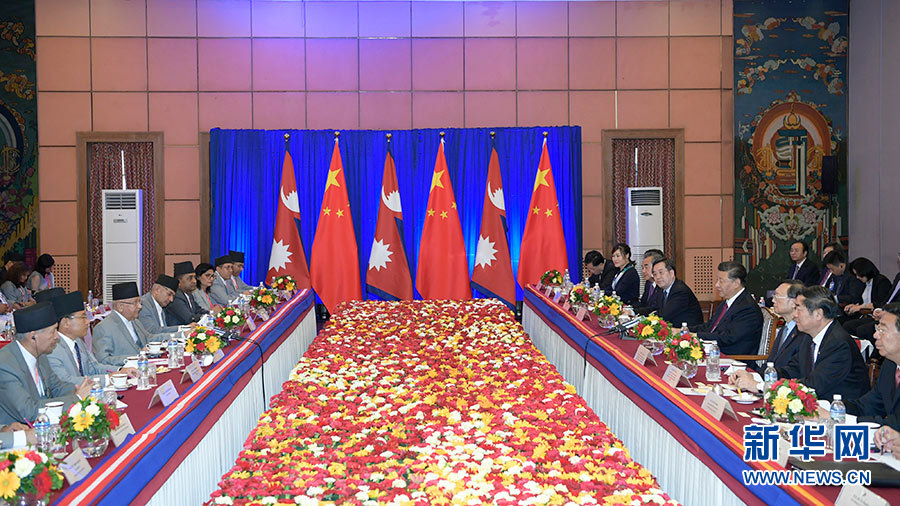 习近平强调,中方赞赏尼方坚定奉行一个中国政策,在涉及中国核心利益问题上给予中方坚定支持。任何人企图在中国任何地区搞分裂,结果只能是粉身碎骨;任何支持分裂中国的外部势力只能被中国人民视为痴心妄想! 习近平强调,中尼应该从以下几个方面规划两国关系。一是深入对接发展战略,中方支持尼方发展经济、改善民生,努力实现“繁荣尼泊尔、幸福尼泊尔人”的美好愿景,愿同尼方加强政策沟通,开展治理能力交流合作。二是加快提升联通水平,将共建“一带一路”同尼泊尔打造“陆联国”国策对接,积极考虑升级改造跨境公路,启动跨境铁路可行性研究,逐步增开边境口岸,增加两国直航,加强通信合作,加快构建跨喜马拉雅立体互联互通网络。三是促进贸易和投资,推进中尼跨境经济合作区建设,推动产能和投资合作。中方愿帮助尼方合理开发水电。四是增进民心相通,促进教育、旅游、地方等领域交往。中方将继续为尼泊尔地震灾后重建提供力所能及的帮助。做好供水水质改善项目,加强珠穆朗玛峰保护合作。五是加强执法合作,共同打击恐怖主义和跨国犯罪,维护共同安全。六是加强多边协调,共同支持多边主义和自由贸易体制,维护两国发展权利。 ![]()