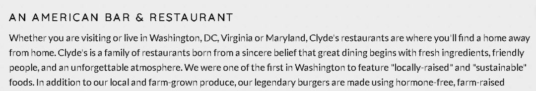 根据Clyde's官网介绍,这家餐厅从两间屋子的酒吧起家,经营宗旨是:“让顾客觉得到了另一个家”,并且相信“一顿好饭来自新鲜的食材、友好的人、难忘的氛围”,他们同时还是华盛顿餐馆中专注于“本地化”和“可持续”的先行者。