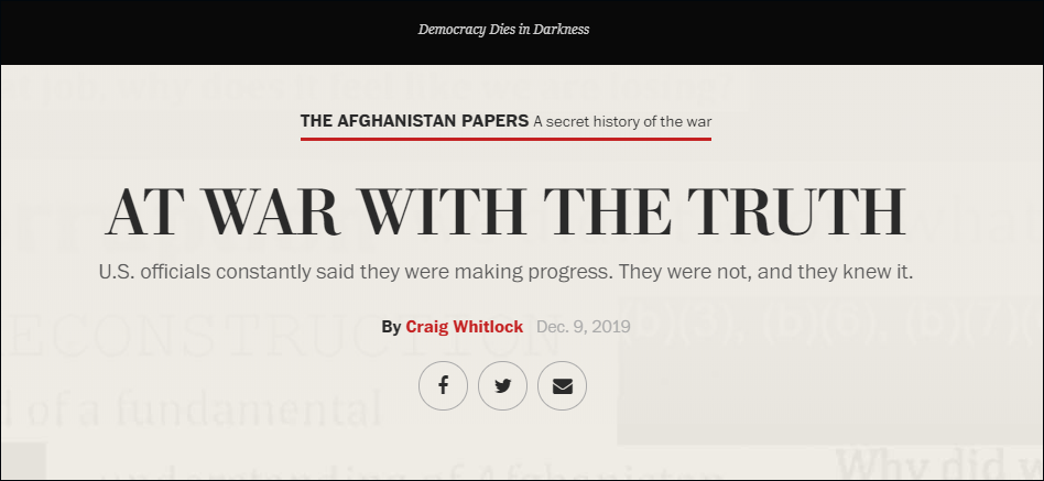华盛顿邮报报道截图 该文件是由一个美国联邦政府项目提供的,该项目旨在调查阿富汗战争——美国历史上持续时间最长的武装冲突的根源,其中包括2000多页以前未发表的采访记录。 《华盛顿邮报》打了3年官司后,在《信息自由法》的支持下,才得以在今日予以将文件公布于世。 这份文件包括政府对高级军事人员的采访,采访对象包括在战争中发挥直接作用的人,从将军、外交官到援助人员和阿富汗官员。从2014-2018年,美国政府共采访了近600人。在采访中,超过400位内部人士对阿富汗战争提出批评。 这些受访发人深省,使人们深刻地认识到战争的核心缺陷,而这些缺陷一直持续到今天。它们还强调了三位总统,包括乔治·w·布什(George W. Bush)、巴拉克·奥巴马(Barack Obama)和唐纳德·特朗普(Donald Trump),以及他们的军事指挥官,如何未能兑现在阿富汗取得胜利的承诺。 除了采访记录外,《华盛顿邮报》还获得了前国防部长唐纳德·拉姆斯菲尔德(Donald H. Rumsfeld)在阿富汗战争第一阶段(2001-2006年)的口授备忘录。