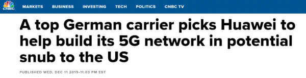 ▲CNBC网站报道截图 美国有线电视新闻网(CNN)12月12日分析称,尽管关于华为的争论日益激烈,但西班牙电信(德国)有限公司的公告表明,它亟须在超高速网络上尽快开展工作。 值得注意的是,多家美媒共同指出,与中国和美国相比,欧洲国家在5G网络建设进度上已经稍显落后。 而这也被认为是西班牙电信(德国)有限公司不顾政治压力,坚决推进5G建设的重要原因。 事实上,德国其他电信运营商也同样着急。《华尔街日报》引述德国电信公司的说法称,由于目前政治局势不明朗,该公司尚未与任何供应商签署5G合同。 “我们希望,德国的5G能尽快获得政治透明度,以免落在后面。”德国电信说。 外媒预测:将有越来越多欧洲国家选择华为 “如果没有可核查的事实,就不能任意将供应商排除在市场准入之外。” 12月2日,德国经济能源部长彼得·阿尔特迈尔在接受德国《商报》采访时说道。 事实上,恰恰是渲染“别国间谍说”的美国被曝光曾监控德国机构和个人。 美国过往的劣迹,也让外国网友对德国未按美国要求排除华为的决定多了一份理解。