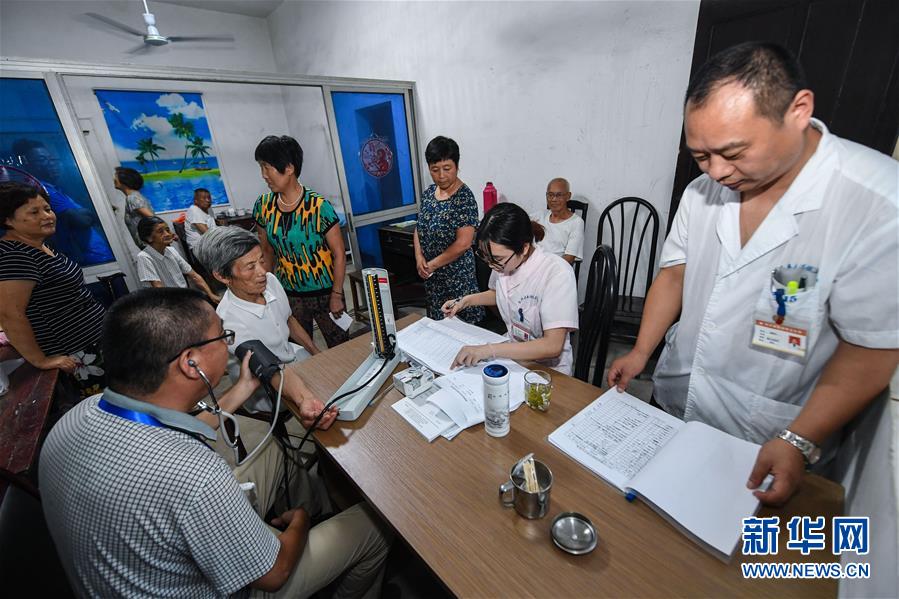 浙江省长兴县夹浦镇卫生院医生在环沉村一户村民家中设立临时巡诊点,为村民进行免费身体检查(2017年8月3日摄)。新华社记者 徐昱 摄
