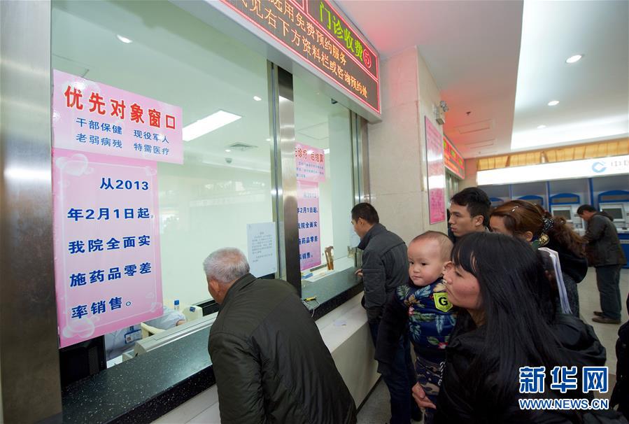 就医者在福建省三明市第一医院收费处缴费(2014年12月30日摄)。收费处窗口张贴着“药品零差率销售”告示。新华社记者 姜克红 摄