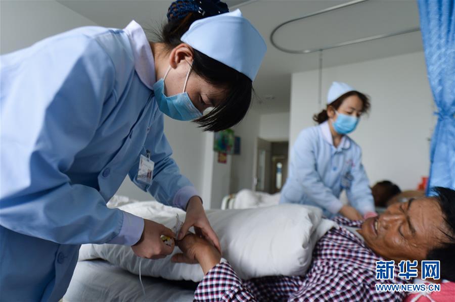 青海格尔木人民医院护士张建文(左)在为患者输液(2014年5月29日摄)。新华社记者 吴刚 摄