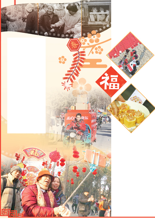 图①:1986年,河北辛集,买年画。 图②:1991年,山东桓台新城服装大集,试新衣。 图③:1995年,春节前夕。广州火车站客流高度集中。不得已,闷罐车当客车用。 图④:2016年2月,北京,快递年货。 图⑤:2019年,游人在北京地坛庙会用手机自拍。 蒋 铎摄