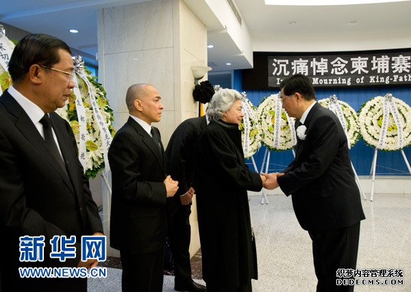 资料图:胡锦涛在北京医院出席西哈努克遗体告别仪式,向柬埔寨太后莫尼列、国王西哈莫尼、首相洪森表达哀悼和慰问。 告别仪式后,西哈努克太皇灵柩由专机运回柬埔寨,国务委员戴秉国同莫尼列太后、西哈莫尼国王、洪森首相等同机护送。 天安门广场、新华门、外交部、首都机场等地降半旗。