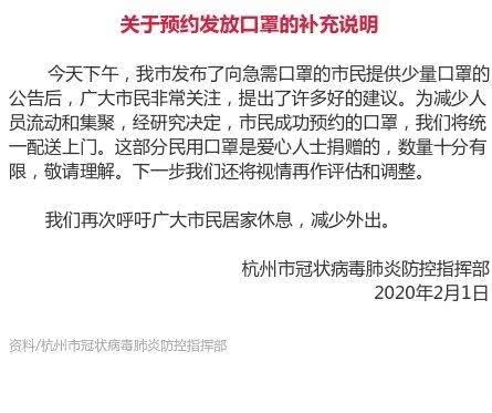 中新网客户端2月2日电(宋宇晟)@杭州发布 1日发布公告称,杭州市民可免费预约申领口罩。据悉,杭州市医疗保障局将组织实施每天定量免费发放口罩。市民可通过杭州市医疗保障局微信公众号口罩预约登记系统实名登记,凭预约登记的身份证领取。10日内每人限领一次,每次限领5只。1日晚,@杭州发布 再次发布补充说明称,为减少人员流动和聚集,口罩将统一配送上门。“这部分民用口罩是爱心人士捐赠的,数量十分有限,敬请理解。下一步我们还将视情再作评估和调整。”
