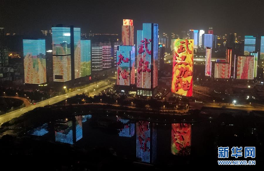 1月31日,武汉市江汉区西北湖附近高层建筑外墙打出“武汉加油”等字样(无人机照片)。 新华社记者肖艺九摄