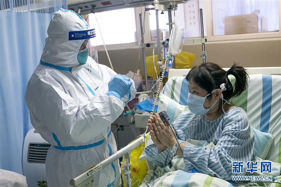 1月24日,在武汉大学中南医院重症隔离病房,中南医院重症医学科主任彭志勇(左)与病情好转的患者黄淑丽互道新春快乐。 新华社记者熊琦摄