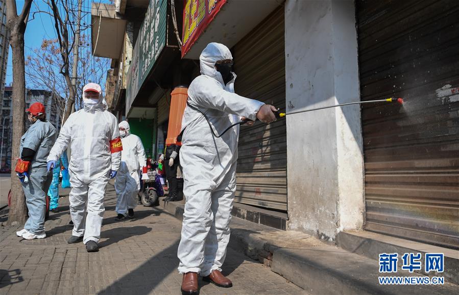 2月9日,武汉市江岸区花桥街道志愿者在对街区进行消杀作业。 新华社记者程敏摄