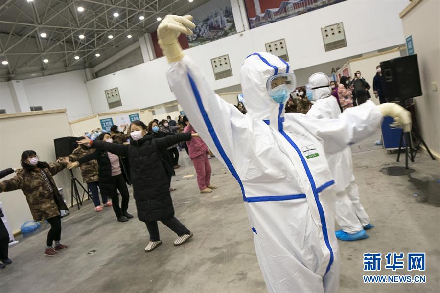 2月10日,在武汉客厅方舱医院,医护人员带领患者们跳舞。 新华社记者熊琦摄
