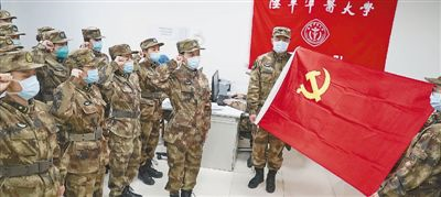 2月1日,在武汉金银潭医院,陆军军医大学医疗队队员在党旗前宣誓。新华社记者 程 敏摄