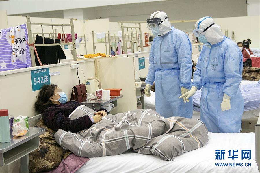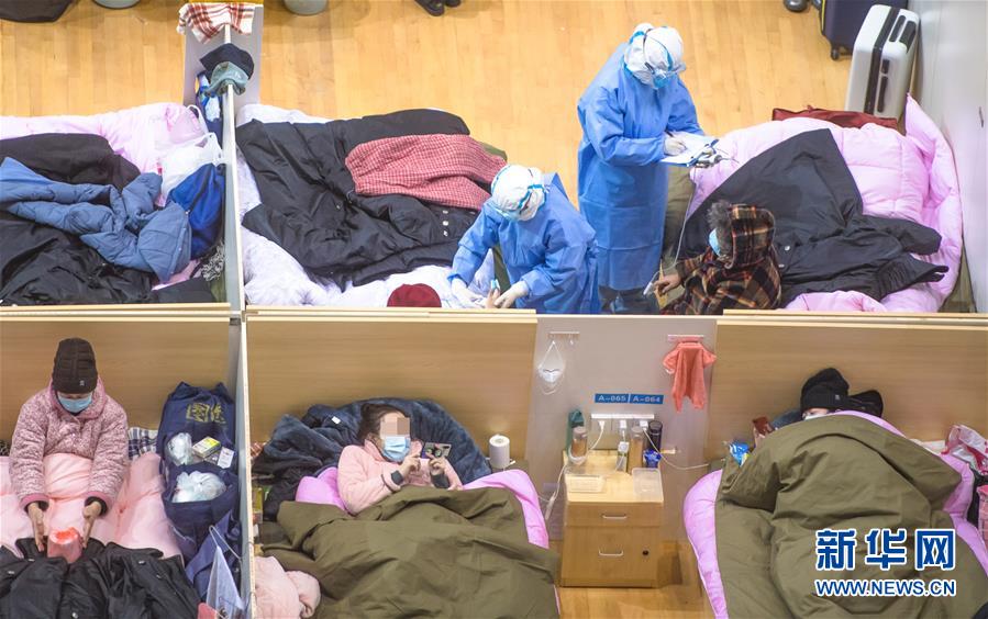2月17日,在武汉体育中心方舱医院,江苏医疗队的医护人员为患者做检查。新华社记者 肖艺九 摄