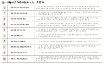中央应对新型冠状病毒感染肺炎疫情工作领导小组印发《关于全面落实进一步保护关心爱护医务人员若干措施的通知》(以下简称《通知》)。 《通知》指出,新冠肺炎疫情发生以来,全国广大医务人员义无反顾冲上疫情防控第一线,为保护人民生命健康作出重大贡献。当前全国疫情防控进入关键时期,医务人员工作任务重、感染风险高、工作压力大,各地各有关部门务必高度重视对他们的保护、关心、爱护,加强各方面支持保障,解除他们的后顾之忧,使他们始终保持强大战斗力、昂扬斗志、旺盛精力,持续健康、心无旁骛投入战胜疫情斗争。 《通知》就进一步保护关心爱护医务人员提出十方面措施。一要提高疫情防治人员薪酬待遇。各地要在落实现有政策基础上,将湖北省(含援湖北医疗队)一线医务人员临时性工作补助标准提高1倍、薪酬水平提高2倍,扩大卫生防疫津贴发放范围,确保覆盖全体一线医务人员。二要做好工伤认定和待遇保障。各地要做好因履行工作职责感染新冠肺炎医务人员的工伤认定,开辟绿色通道、简化理赔程序,保障医务人员及时享受工伤保险待遇。三要实施职称评聘倾斜措施。一线医务人员在职称评聘中优先申报、优先参评、优先聘任,晋升职称、晋升岗位等级不受本单位岗位结构比例限制。医务人员参加疫情防治经历可视同为一年基层工作经历。四要落实一线医务人员生活保障。为一线医务人员提供基础性疾病药物、卫生用品以及干净、营养、便捷的就餐服务,舒适的生活休息环境和与家人隔离的必要条件。采取专车接送解决定点医院一线医务人员通勤问题。五要加强医务人员个人防护。全力救治受感染的医务人员。医用防护品要重点向疫情防控一线投放使用,特别是要全力保障定点救治医院、发热门诊、集中隔离观察点等一线医务人员防护物资需求。六要确保轮换休整到位。对长时间高负荷工作人员安排强制休息。疫情结束后,及时组织一次免费健康体检和疗养休养,并适当增加休息和带薪休假时间。七要及时做好心理调适疏导。开展一线医务人员心理健康评估,强化心理援助措施,做到心理问题早发现、早干预、早疏导。八要切实落实有困难家庭的照顾帮扶。开通一线医务人员家属就医绿色通道,建立社区干部联系帮扶一线医务人员家庭制度,对于一线医务人员子女教育给予更多帮助关爱。九要创造更加安全的执业环境。完善问责机制,维护医疗秩序,保障医务人员合法权益。对于伤害医务人员的,坚决依法严肃查处。十要开展烈士褒扬和先进表彰。依法做好因疫情防控牺牲殉职人员的烈士评定和褒扬工作,全面做好抚恤优待。开展医务人员及时奖励和表彰,对于获得表彰以及被认定为烈士的医务人员的子女,在入学升学方面按规定享受相关待遇。