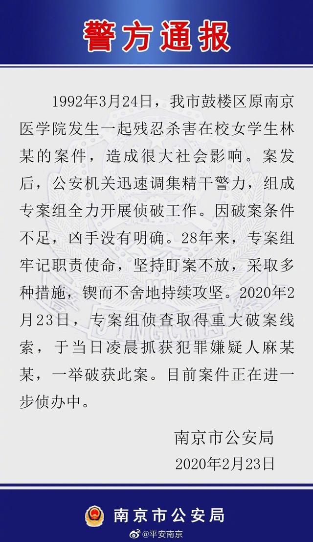 ![]() 据昨晚,南京警方发布通报称:“1992年3月24日,我市鼓楼区原南京医学院发生一起残忍杀害在校女学生林某的案件,造成很大的社会影响。案发后,公安机关迅速调集精干警力,组成专案组全力开展侦破工作。因破案条件不足,凶手没有明确。28年来,专案组牢记职责使命,坚持盯案不放,采取多种措施,锲而不舍地持续攻坚。2020年2月23日,专案组侦查取得重大破案线索,于当日凌晨抓获犯罪嫌疑人麻某某,一举破获此案。目前案件正在进一步侦办中。" ![]() 南京大学有两大非常残酷的杀人案件,一直没有告破。 据网友批漏,此次因为新冠状病毒,这起案件的做案人的舅舅入院,被提速了DNA,结果阴差阳错的和警方基因数据库中犯罪消息人的基因比对,高度相似,警察以此排查了,麻氏家族的成员,最终将犯罪嫌疑人抓获。 ![]() 具体的实际情况如何,还要等警方审理,以官方最终的审理结果为准。更多细节,我们期待警方的进一步侦破。 天网恢恢,疏而不漏,姑娘可以瞑目了。 她的家人也可以告慰姑娘的在天之灵了。很多年前,选择的医学事业,就这样阴差阳错的将案件告破了。 (责任编辑:晓歌) |