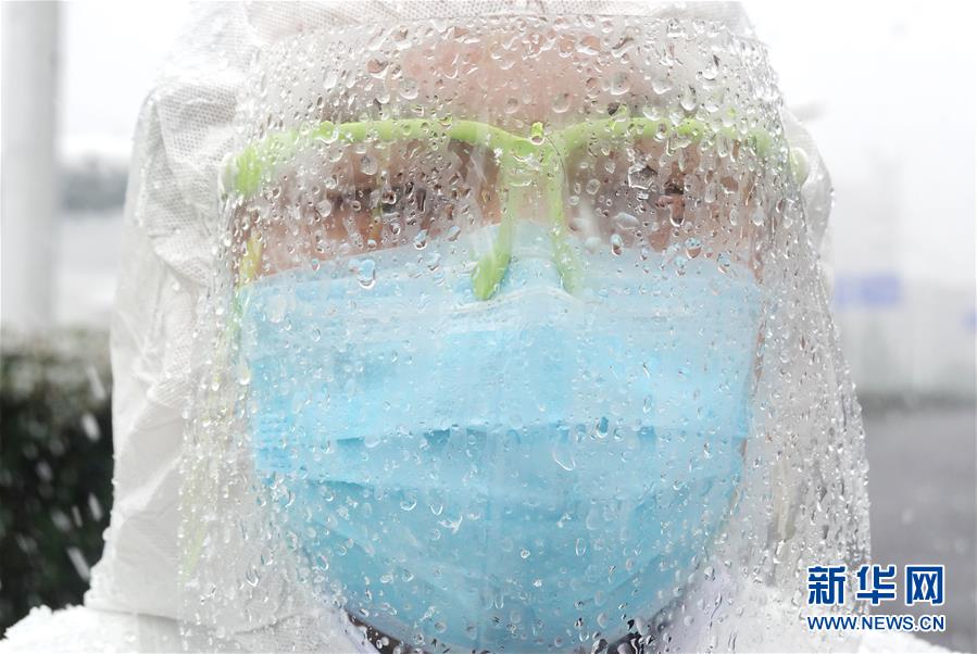 在武汉客厅方舱医院,武汉市公安局东西湖区交通大队快骑队警务人员在现场执勤。由于雨雪天气,护目镜上满是雾水(2月15日摄)。 新华社记者 才扬 摄