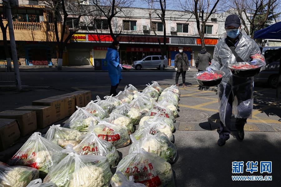 在武汉,下沉花桥社区的干部在搬运居民订购的草莓(2月20日摄)。 新华社记者 沈伯韩 摄