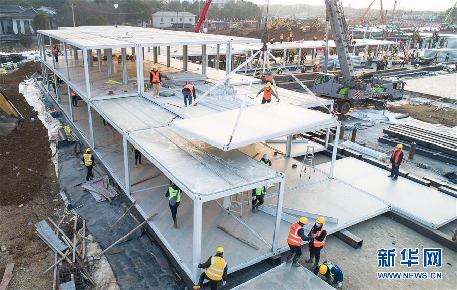 在武汉火神山医院建设工地,来自中建三局的工人在加紧施工(1月28日摄,无人机照片)。 新华社记者 肖艺九 摄